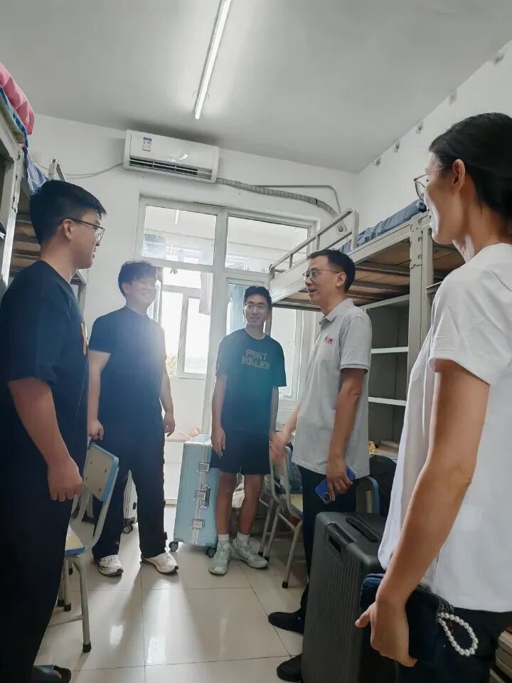 迎新期间,学院领导前往新生宿舍,与2025级学生及家长亲切交谈。他们仔细查看宿舍的住宿环境,询问新生们是否适应新的生活,鼓励同学们尽快熟悉校园、融入集体,在新学期里规划好学习与生活,遇到困难及时向老师和学长学姐求助。领导们的暖心话语和细致关怀,让初到校园的新生们倍感温暖,也更坚定了他们在大学开启新征程的信心。