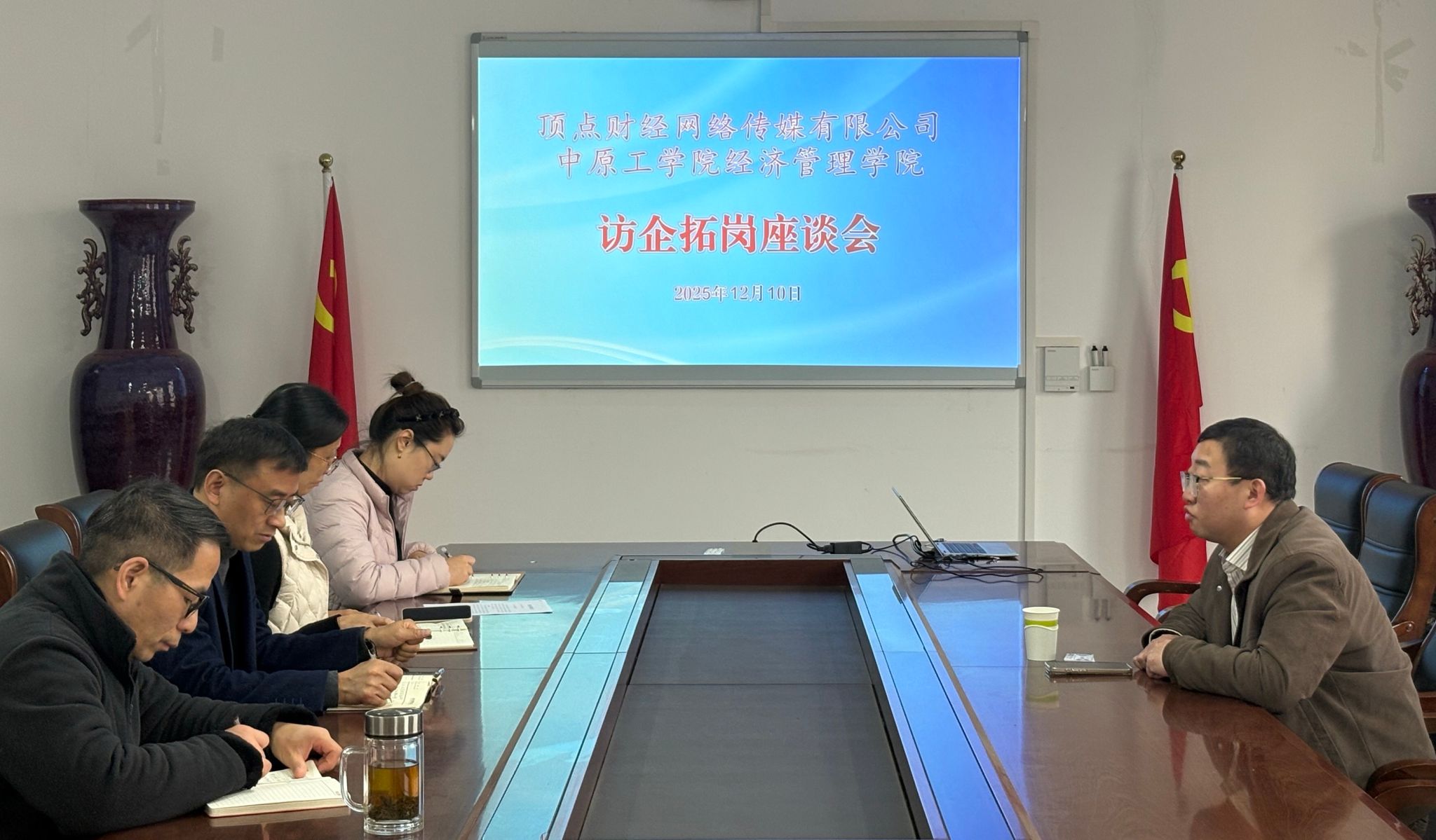 2025年12月10日,我院与顶点财经网络传媒有限公司在3号组团楼A306会议室开展访企拓岗和校企合作洽谈会。顶点财经网络传媒有限公司三分公司总经理谢林慧,学院党委书记李向东、党委副书记王琳、金融学系主任刘鹏、学工办副主任陈金参加。
